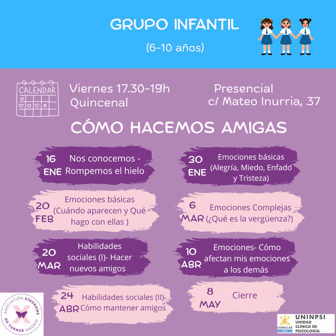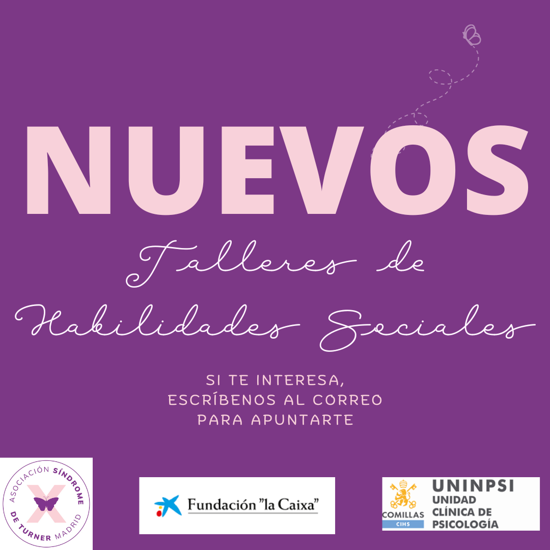 Se confirman dos talleres de habilidades sociales para niñas (6-10 años) y adolescentes (14-18 años) con síndrome de Turner. Gracias a La Fundación la Caixa, en enero comenzaremos de la mano de la Unidad de Psicología Clínica de la Universidad Comillas (Uninpsi), 2 talleres que ayudarán a nuestras chicas a encontrar y fortalecer sus habilidades para relacionarse con los demás.